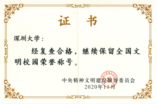 近日,中央精神文明建設(shè)指導(dǎo)委員會頒發(fā)證書,深圳大學(xué)通過復(fù)查,繼續(xù)保留全國文明校園榮譽(yù)稱號。這是中央主管部門對深圳大學(xué)精神文明建設(shè)和辦學(xué)治校綜合性成就的一次全面肯定,標(biāo)志著深圳大學(xué)打造新時代中國特色社會主義標(biāo)桿大學(xué)工作上了一個新的臺階。