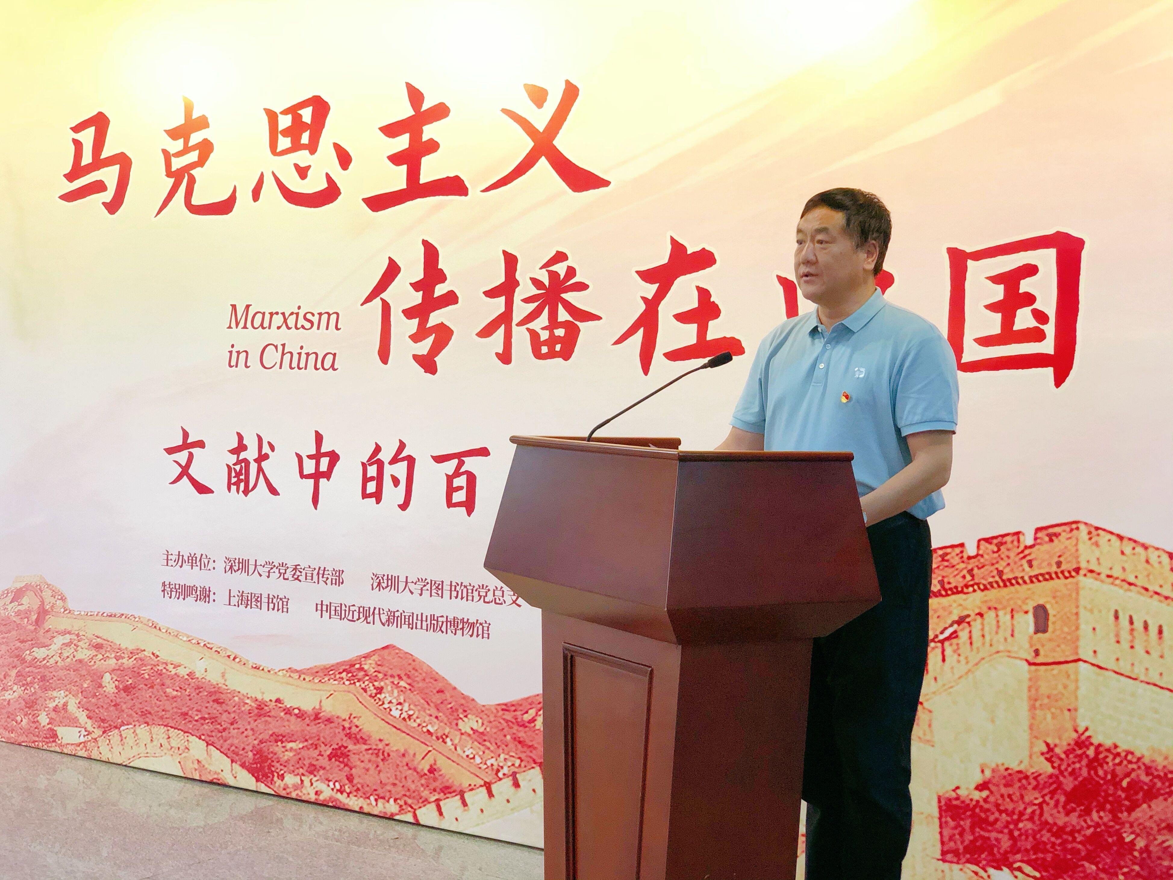 為深入學習貫徹習近平總書記在黨史學習教育動員大會上的重要講話精神,推進黨史學習教育進校園,圖書館黨總支在校黨委宣傳部指導下,聯合《全國報刊索引》編輯部共同舉辦“馬克思主義傳播在中國:——文獻中的百年黨建”圖文展。2021年5月18日下午,圖文展開幕式在深圳大學匯智樓(圖書館南館)二樓大廳舉行。深圳大學黨委副書記范志剛出席開幕式并致辭。