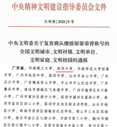 近日,中央精神文明建設指導委員會頒發證書,深圳大學通過復查,繼續保留全國文明校園榮譽稱號。這是中央主管部門對深圳大學精神文明建設和辦學治校綜合性成就的一次全面肯定,標志著深圳大學打造新時代中國特色社會主義標桿大學工作上了一個新的臺階。