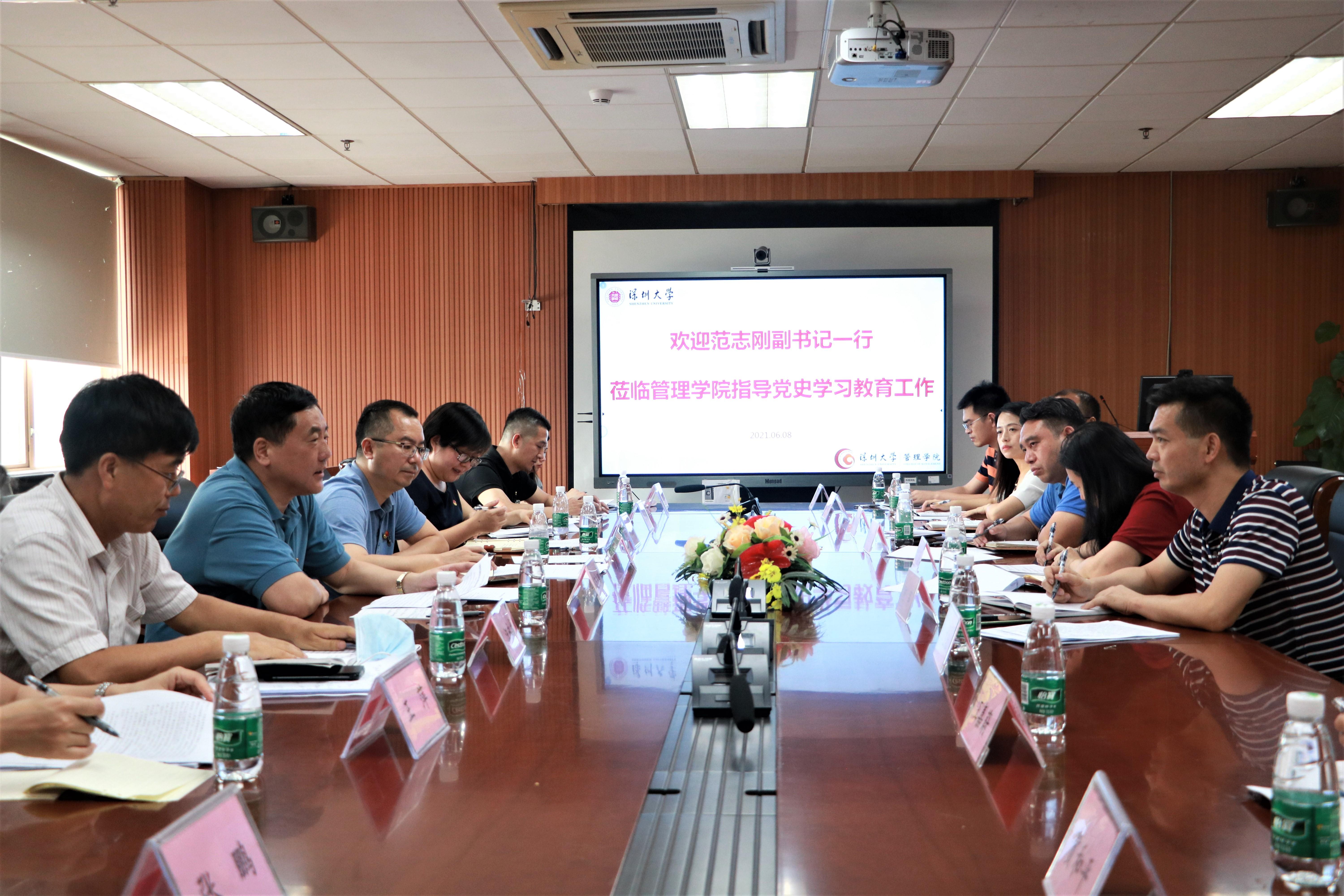 6月8日下午,我校黨委副書(shū)記、深圳大學(xué)黨史學(xué)習(xí)教育領(lǐng)導(dǎo)小組常務(wù)副組長(zhǎng)范志剛對(duì)管理學(xué)院黨委黨史學(xué)習(xí)教育開(kāi)展情況進(jìn)行調(diào)研指導(dǎo)。黨委組織部統(tǒng)戰(zhàn)部、黨委宣傳部主要負(fù)責(zé)人,管理學(xué)院領(lǐng)導(dǎo)班子成員、黨支部書(shū)記、組織員等參加座談。