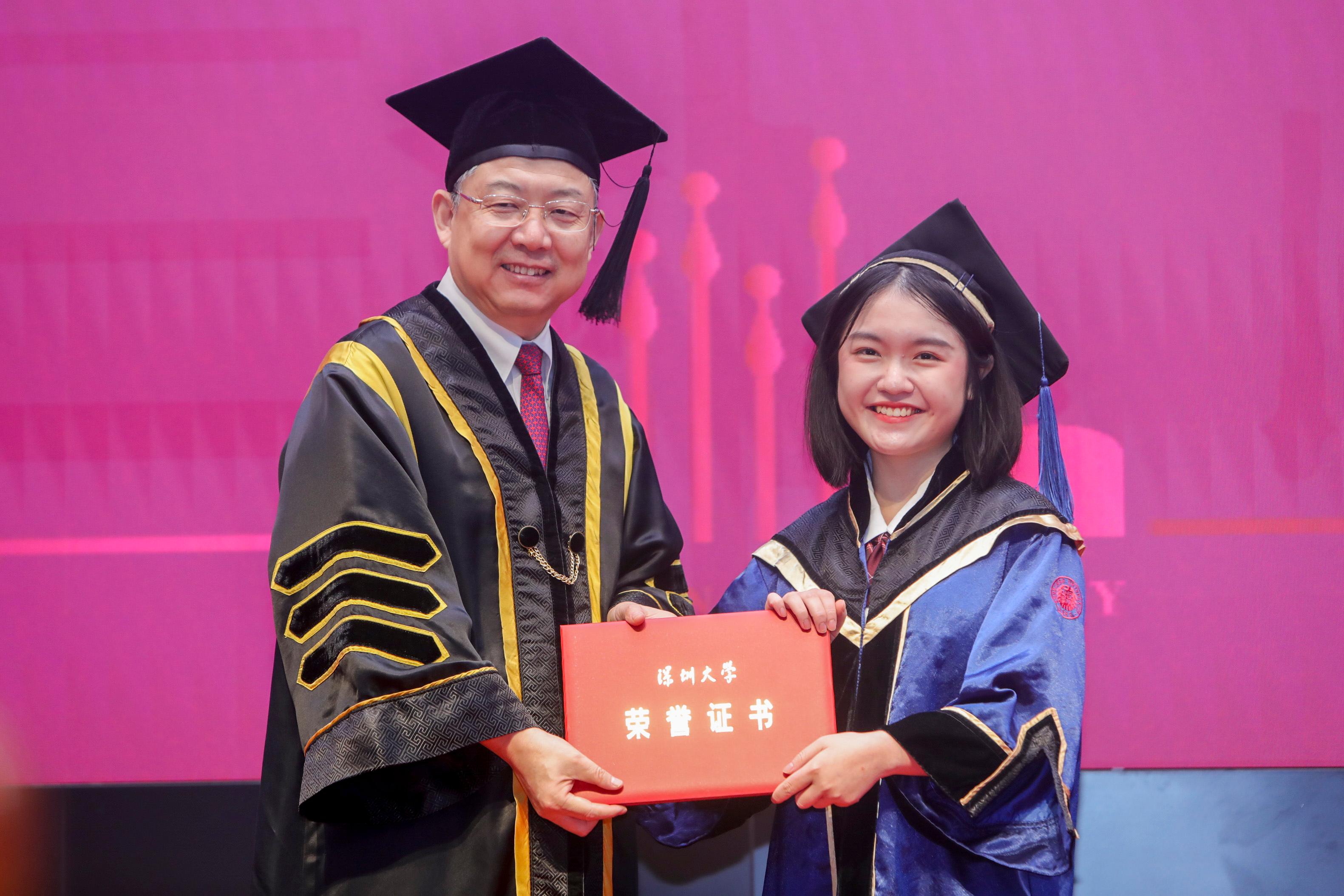 在本科生方面,2021年深圳大學共有6724名應屆本科畢業生。截止6月22日統計,本年度第一批共有5655名本科生按照教學計劃要求完成專業學習,按期取得畢業證書。該批本科生有5655名符合學校學士學位授予條例的有關規定,經學校學位評定委員會審議批準獲得學士學位。本學期期末考試后還將有第二批學生達到相關教學計劃要求并取得畢業證書和學士學位。在2021屆學生中有223位同學獲得雙學士學位;109位同學完成了輔修專業的學習;192名學生被授予榮譽學士學位。230名應屆本科畢業生獲得推免碩士研究生資格。1245名同學被國內外高校和科研機構錄取為碩士研究生,占本屆畢業生人數的18.95%,比去年同期增加了44人,增加1.32個百分點。該批學生考取的國內外著名高校和科研機構包括北京大學、清華大學、哈佛大學、劍橋大學等。2021屆學生積極參與各級各類學科競賽,榮獲國際、國家、省各級獎勵。在各類學科競賽中,共獲獎493項,含83個國際級獎項、153個國家級獎項、257個省部級獎項。332位同學被評為深圳大學2021屆優秀本科畢業生。593位同學在校期間光榮加入了中國共產黨。