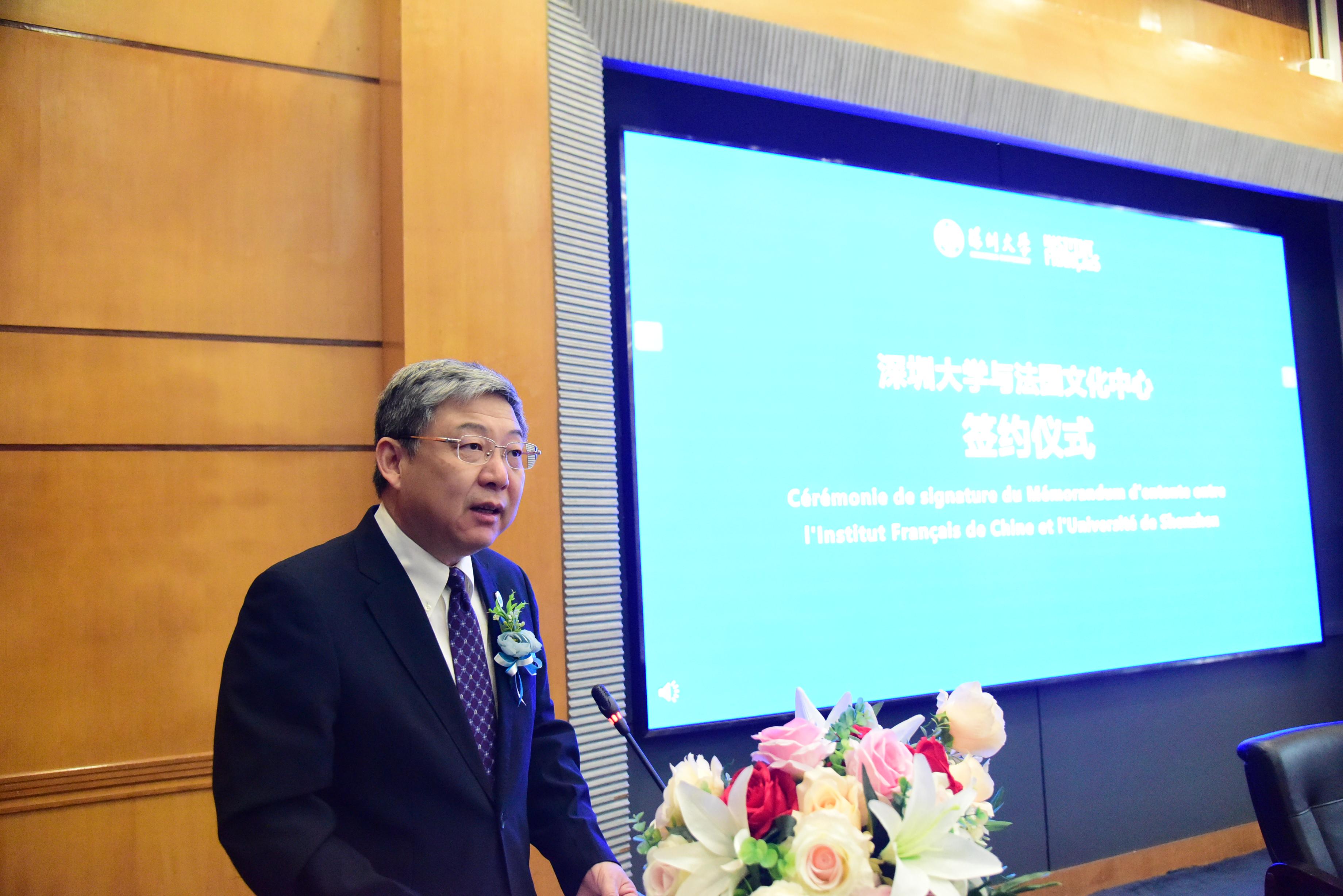 李清泉在簽約儀式上致辭。他對法國友人及嘉賓的到來表示歡迎,并表示深圳大學非常重視與北京法國文化中心的合作,深圳法語聯盟是中法友好的橋梁紐帶,也是中法教育合作交流的重要窗口。法語聯盟為深圳大學與法國學校締結友好關系、派遣學生赴法交流以及開展中法文化交流活動等提供了便利條件。深圳大學法語專業雖然成立較晚,但發展態勢良好。在不久前舉行的2021金羽毛法國知識國際競賽(Plume d’or)中,深圳大學有25位法語專業的學生參加,其中肖培欣、黃惠梓和王森霓三名同學進入世界百強。李清泉表示,相信在深圳大學與法國文化中心的共同努力下,深圳法語聯盟和深圳大學的法語專業一定可以協作共贏,為深圳和法國省市之間的跨文化交流提供重要的合作交流平臺。